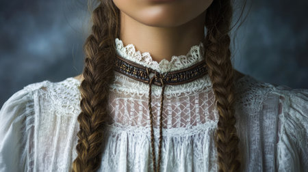 This captivating close-up portrait showcases a young woman with elegantly braided hair dressed in a vintage lace blouse, highlighting intricate details and textures.