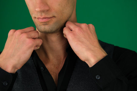 close-up of a mans hands straightening a black shirt, he gives us the background of a vest of a classic suit, shoulders from different sides, set Three photos
