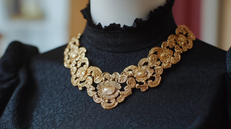 This image features an exquisite gold necklace elegantly displayed on a high-neck black garment, emphasizing its intricate design and luxurious appeal under soft natural light.