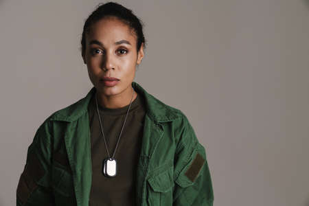 Confident african american soldier woman posing and looking at camera isolated over grey wall