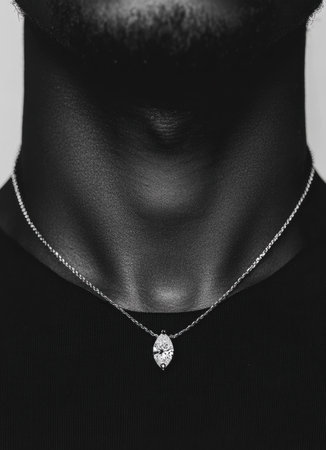 Close up portrait of a Black male model wearing a stylish silver necklace with a delicate pendant, showcasing modern fashion and elegance