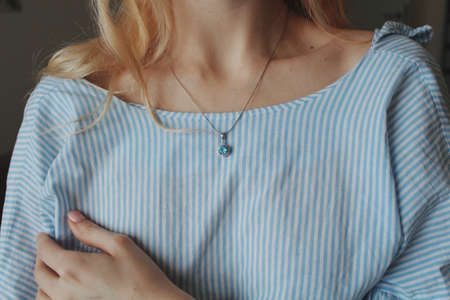 A closeup shot of a female in a blue shirt wearing a beautiful necklace with a nice pendant