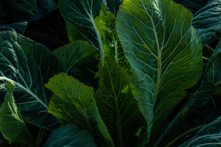 Green cabbage leaves in a contrasting light. Green leaves in a contoured light. A cabbage leaf lit by the sun. The queen of slaw.