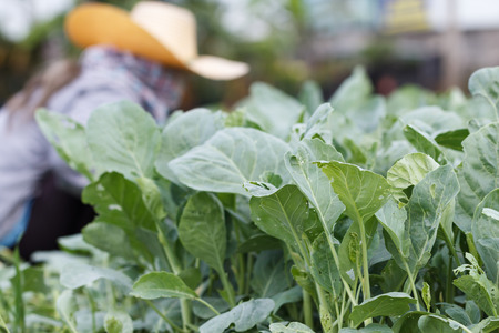 Kale on the farm with farmer harvesting in back, farming is an agricultural industry in Thailand.