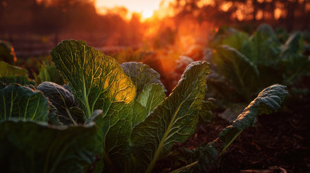 The Napa cabbage at sunset, Golden red sunset light filters through the leaves, still atmosphere, warm orange glow blending with natural green tones.
