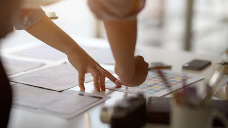 Close up with the hands of two designers who choose some pictures. Team work and planning