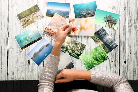 woman looking at photos, remember nostalgia for a day of rest. Spring Photo