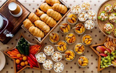 A vibrant arrangement of various foods and drinks on a table, featuring desserts, fruits, and fresh flowers, perfect for a festive gathering or celebration.