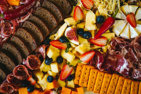 Cheese platter, cheese board meat and board. Vegetables and fruits with cheese and chocolate, prosciutto and salami with bread. Big board of snacks for the party.
