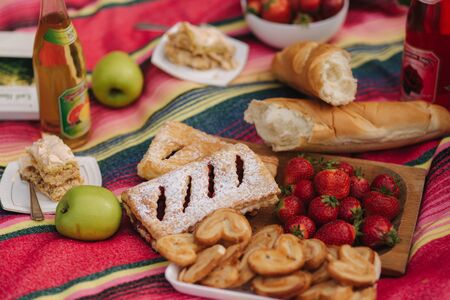 Photo of mini picnic outdoors. Non alcoholic picnic. Fresh strawbery, lemomade and gluten free bread. Red blanket