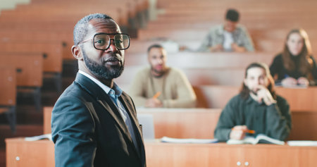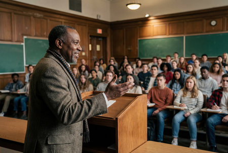 A smiling mature african american professor stands at a wooden podium giving an engaging lecture to a large diverse group of university students seated in rows within a traditional lecture hall.