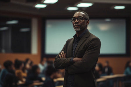 Confident and Thoughtful Black Male Teacher Standing in Front of Classroom with Crossed Arms Focused on Guiding and Educating Students