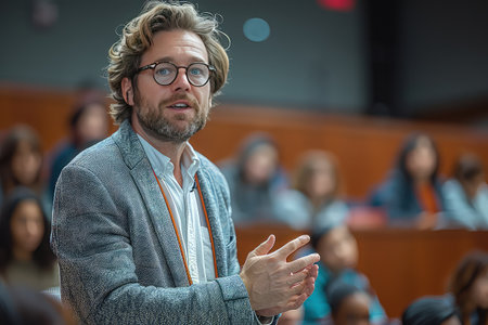 Bearded male presenter is delivering a speech at a conference, with an attentive audience in a modern auditorium, highlighting effective communication and engagement