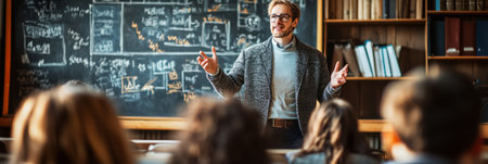 A knowledgeable instructor engages students by explaining intricate ideas in a classroom. The atmosphere is focused, with equations illustrated on chalkboards behind him.