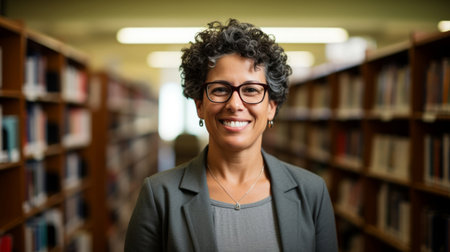 A librarian amidst bookshelves meets the camera with a friendly smile.