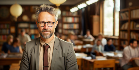 Middle-aged teacher with eyeglasses in the classroom setting, looking at the camera and demonstrating a professional teaching approach