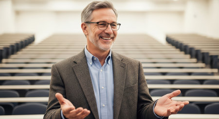 A mature man with glasses stands confidently in a lecture hall, arms crossed, looking at the camera.