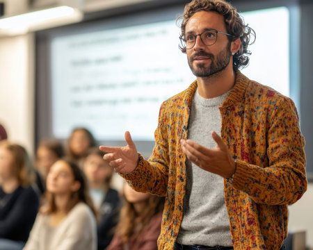 A professional educator teaching a group of attentive students, standing at the front of a vibrant classroom, encouraging thoughtful participation and academic growth, banner
