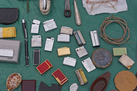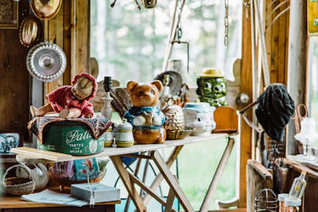 Nova Scotia, August 2018: Collection of antique, used, vintage things for sale at flea market. Souvenir shop with antiques