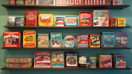 Victorian vintage pastel postcards and painted ceramic plates kitchen decorations on wooden shelf
