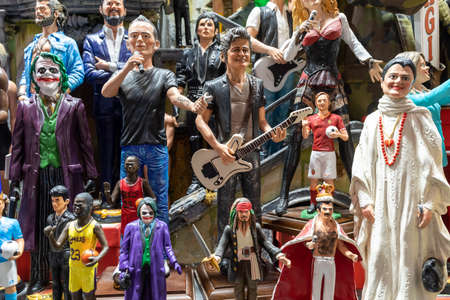 Naples, Italy - December 24, 2021: Hand painted terracotta statuettes, representing famous people, for sale in San Gregorio Armeno, the famous street of Christmas gifts.