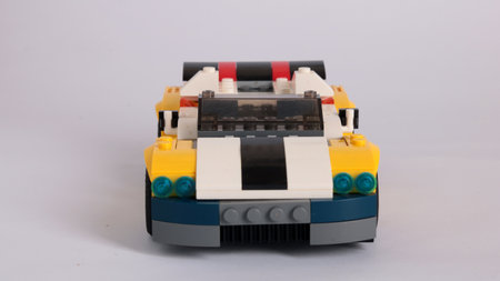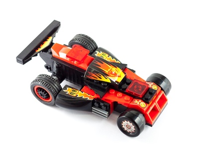 Lego sportcar on a white bacgkround. Unique lego racecar.