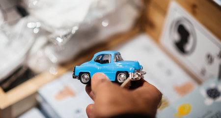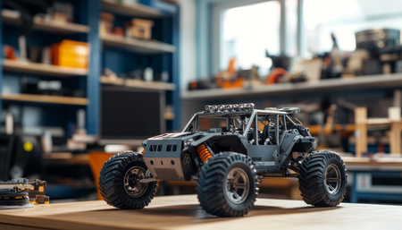 Close up of a metal and plastic off road car model in a modern workshop with tools and books
