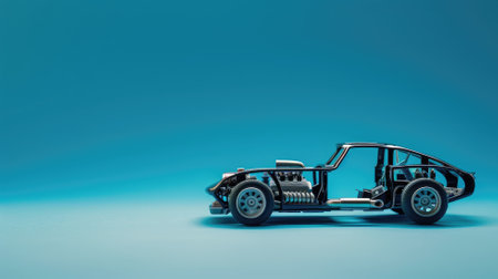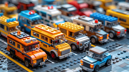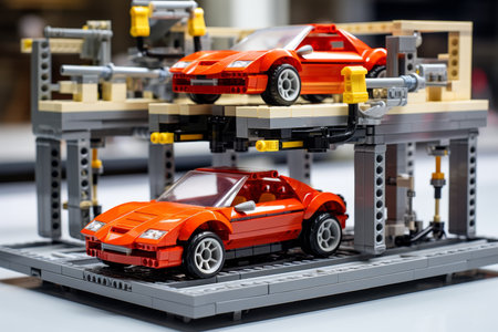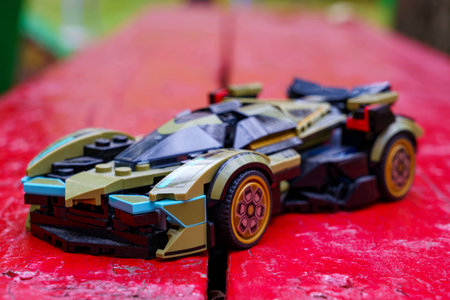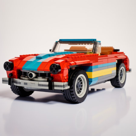 A captivating close-up shot of a Lego car model showcasing vibrant colors and intricate design details. The unique wheels and lighting create a playful atmosphere.