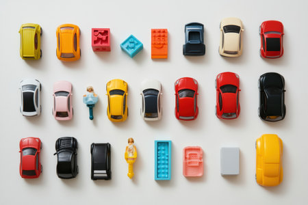 A flat lay arrangement features an assortment of toy cars, colorful blocks, and dolls on a bright white background, offering empty space for text.
