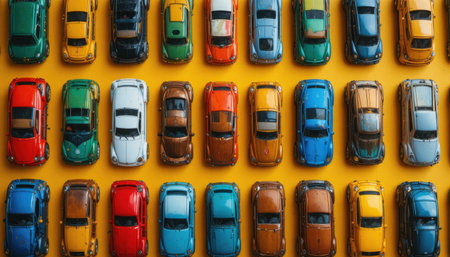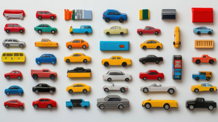 A collection of miniature car models in various colors is displayed neatly against a white background, allowing for creative text placement.