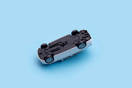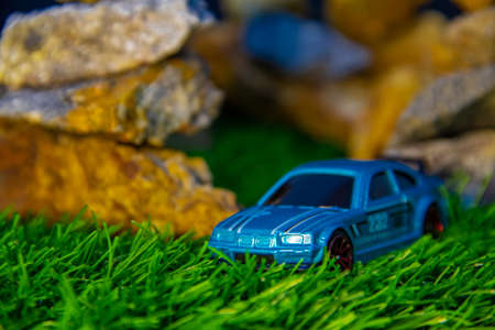 POZNAN, POLAND - Mar 11, 2020: Blue Mattel Hot Wheels Zotic toy futuristic police race car in soft focus background.