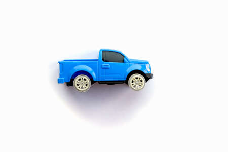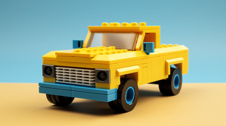 A vibrant blue toy truck sits on a bright white surface. The truck features yellow wheels and a blocky design, inviting creative playtime for children.