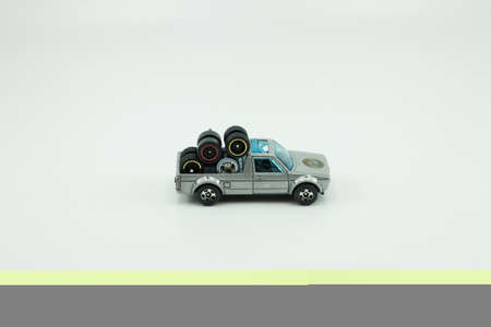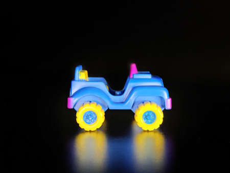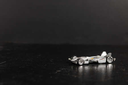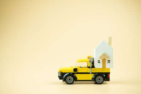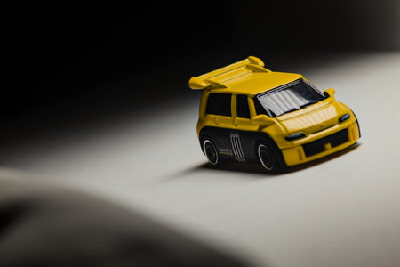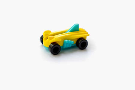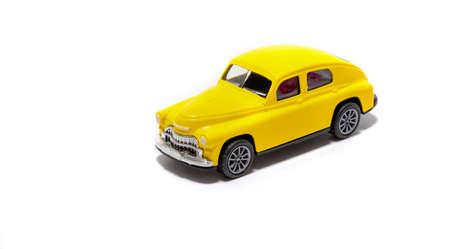 08 November 2020 Ukraine, Zaporizhzhya. Model of toy car on a yellow background with place for text. Banner for toy store toy typewriter cars.