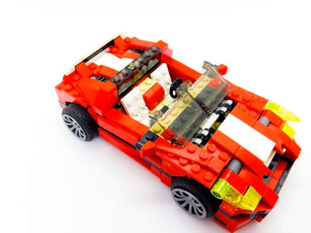 Red toy car which made from the blocks, isolated on white background with clipping path.