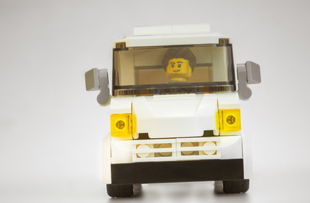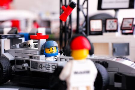 Tambov, Russian Federation - June 24, 2015: Lego McLaren Mercedes MP4-29 race car with driver minifigure in McLaren Mercedes Pit Stop by Lego Speed Champions. Studio shot.