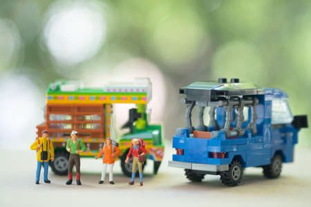 Miniature people : Traveller backpacker standing with Thai farming trucks and Thai style taxi. Travel and Adventure concepts in Thailand