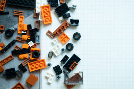 A lot of colorful plastic construction bricks on empty paper notebook. Concept of learning
