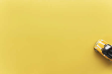 Car rental, trip, travel or weekend activity concept flat lay with yellow small toy cabriolet car on yellow background
