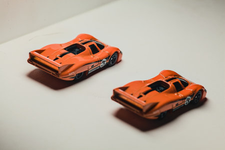 Mantua, Italy - 28TH DECEMBER 2025 - Hot Wheels replicas of two Porsche 917C in orange race livery pretending to have a race on a race track