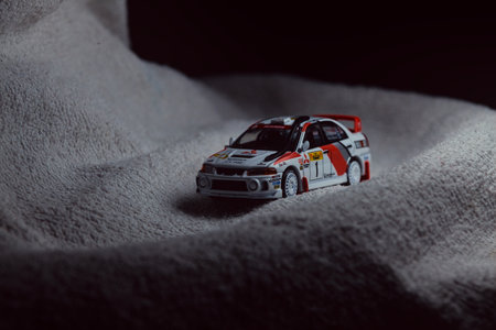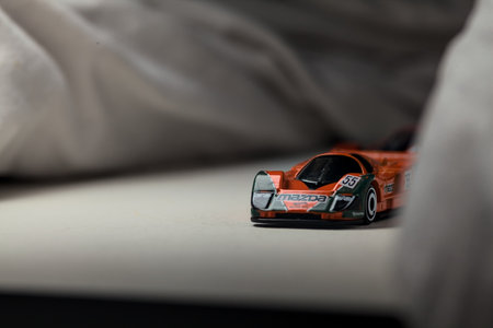 Mantua, Italy - 4TH JANUARY 2025 - Hot Wheels replicas of two Mazda 787B in race livery on white board, bordered by white rolls of fabric, pretending to make a curve on a road and having a race between them