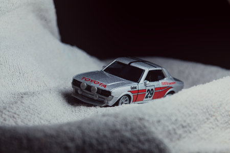 Mantua, Italy - 10TH JANUARY 2025 - Majorette replica of a Toyota Celica GT Coupe pretending to run a rally on a snowy road, next to a cliff, in the mountains