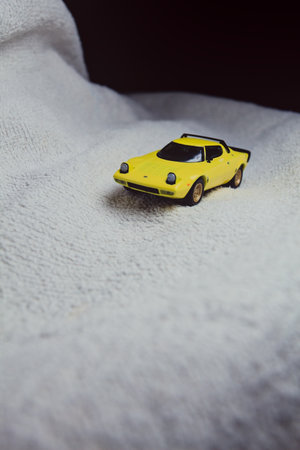 Mantua, Italy - 10TH JANUARY 2025 - Mini GT replica of a yellow Lancia Stratos HF Stradale pretending to run a rally on a snowy road, next to a cliff, in the mountains