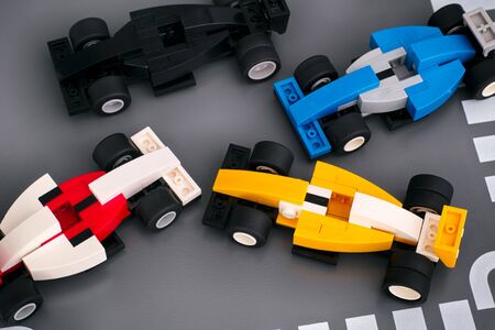 Tambov, Russian Federation - October 21, 2019 Four Lego race cars on road baseplate. Studio shot.