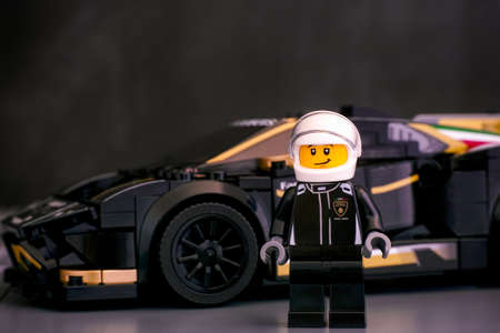 Tambov, Russian Federation - June 25, 2020 Lego Lamborghini Huracan Super Trofeo EVO driver minifigure against his car by LEGO Speed Champions. Black background.