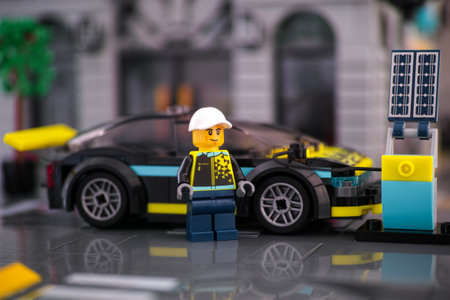 Tambov, Russian Federation - March 23, 2023 A Lego driver minifigure standing near his Electric Sports Car, what charging to charging station in the city