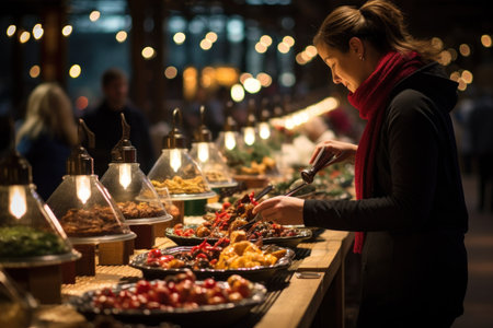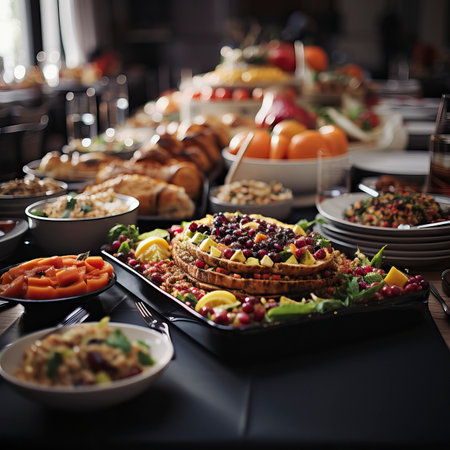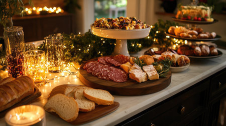 An inviting holiday buffet table adorned with an array of festive dishes and glowing lights, creating a warm, celebratory atmosphere.