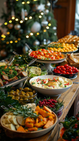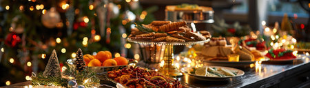 Festive table with delicious assorted food in front of Christmas decorations. Concept of holiday feast, celebration, winter festival, festive cuisine.