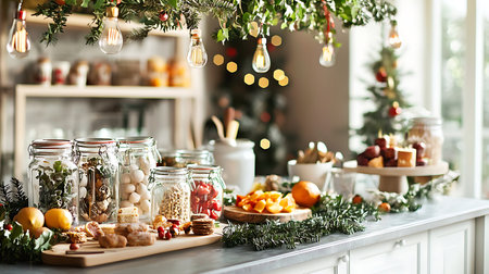 An Exquisite Festive Christmas Table Decor Featuring Treats, Delicious Snacks, and Ornaments