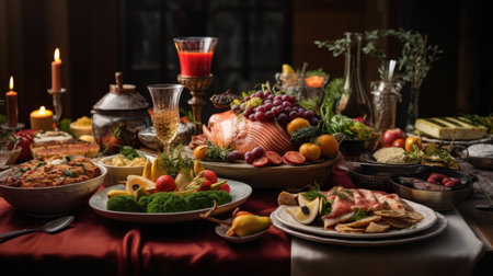 Christmas Feast Lavishly Set Table Laden with Delicious Festive Food, Fruits in Luxury Setting.