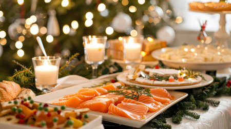 Festive table setting with assorted smoked salmon and cheese platter, candles, and festive decorations. Concept of holiday feast, gourmet food, celebration, dining.